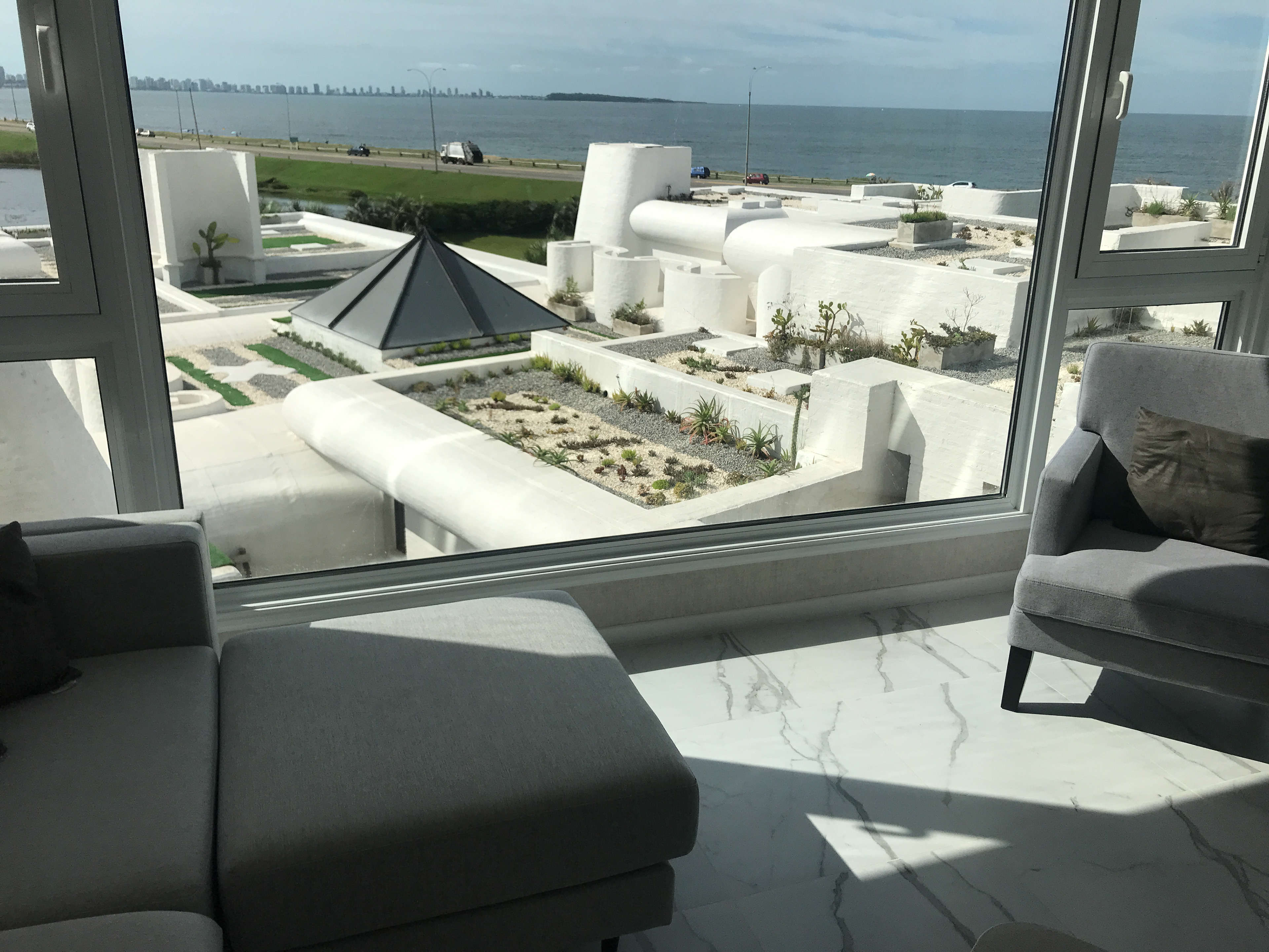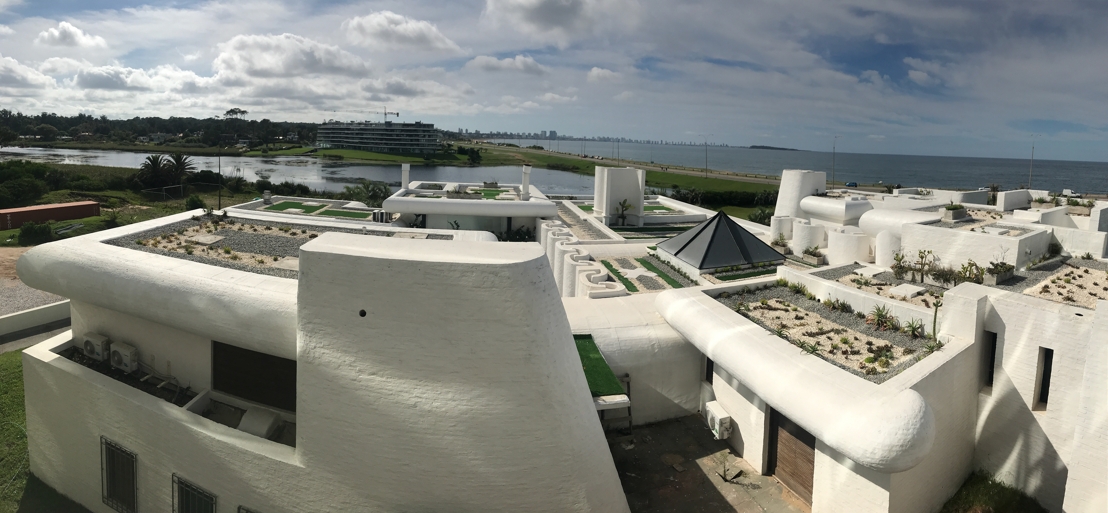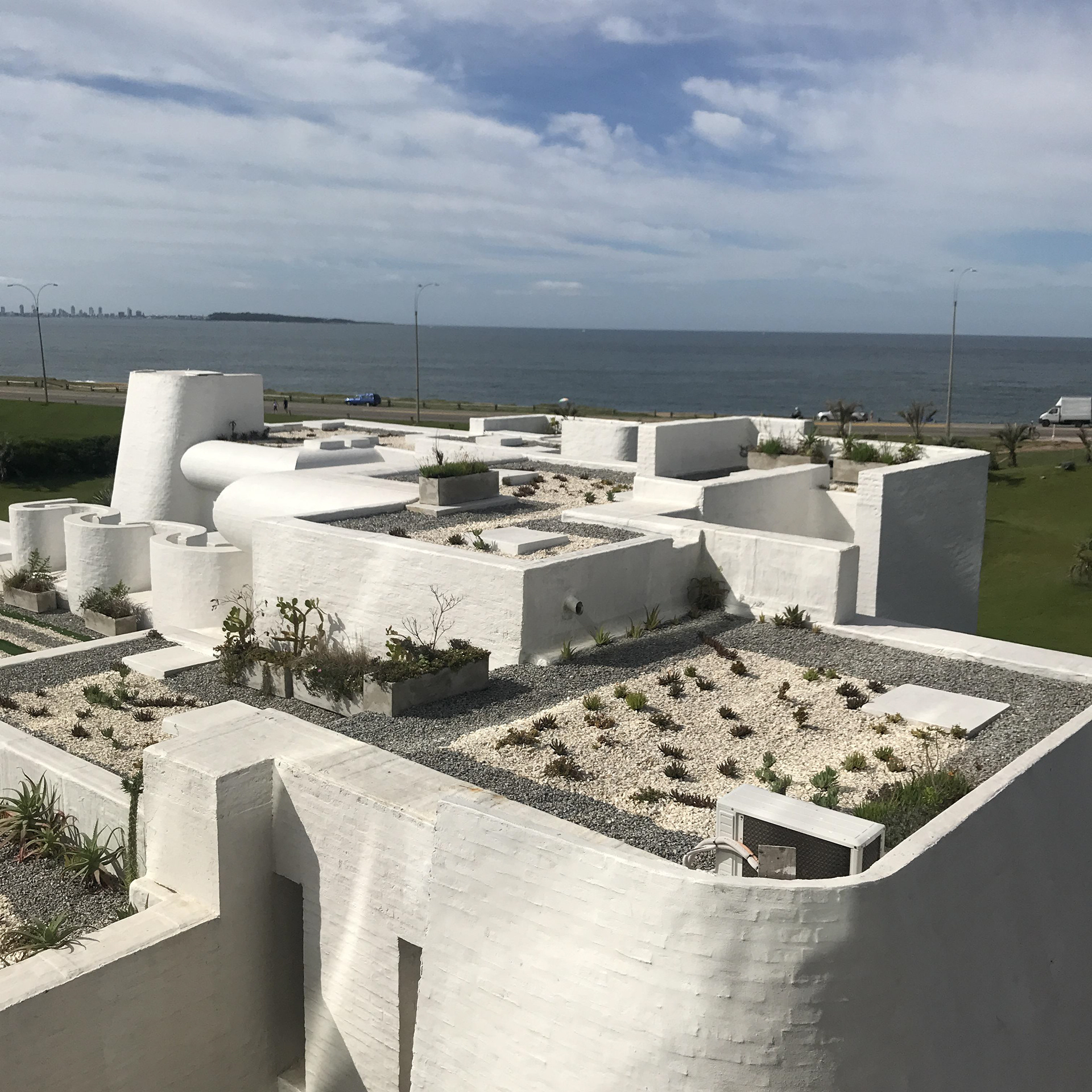 Proyecto paisajístico de los techos del chalet Poseidón del arquitecto Flores Flores, se estructuro el proyecto en relación a las formas de las arquitectura, siguiendo sus líneas y superficies, se trabajó con piedra partida que permitía la generación de patrones, césped sintético ya que la estructura no permitía sobrecarga de peso y plantas cactáceas y suculentas, por su necesidad de poco mantenimiento y su resistencia a ambientes hostiles. El uso de piedra partida responde a que este proyecto es de contemplación visual desde los apartamentos no esta diseñado para ser transitado.